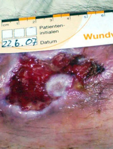 Als chronisch gelten Wunden, deren Heilung mehr als drei Monate in Anspruch nimmt oder sich deutlich länger als üblich verzögert. Ursache für verzögerte Wundheilung sind üblicherweise zumeist Grunderkrankungen wie Diabetes mellitus oder venöse bzw. arterielle Insuffizienz. Stoffwechsel- oder Durchblutungsstörungen beeinträchtigen die Versorgung der betroffenen Hautareale und verzögern die Regeneration bei Verletzungen oder Schädigungen. Die meisten intravenösen Drogengebraucher weisen Ulcera cruris auf, aber in Abhängigkeit von den bevorzugten oder möglichen Injektionsstellen entstehen chronische Wunden auch an den Oberschenkeln oder anderen Körperteilen. Bei Patienten mit chronischen Geschwüren der unteren Extremitäten handelt es sich ganz überwiegend um Konsumenten mit tiefer Bein- oder Beckenvenenthrombose bzw. postthrombotischem Syndrom in Folge der Drogenapplikation in die Leistenvenen. Bekanntermaßen besteht eine lineare Korrelation zwischen der Dauer der Drogeninjektion in die untere Extremität und dem klinischen Schweregrad der chronisch-venösen Insuffizienz (Pieper und Templin 2001: 427ff). Ursächlich dabei zunächst die Schädigung von Endothel und Venenwand, solange die intravenöse Applikation möglich ist (Scott et al. 1995: 624ff); im weiteren Verlauf spielt aufgrund der fortschreitenden Zerstörung oberflächlicher sowie tiefer gelegener Venen die subkutane bzw. intramuskuläre Injektion eine vorrangige Rolle bei der Entstehung von Hautläsionen und chronischen Ulcera (Binswanger et al. 2000: 580f; Pieper und Templin 2003: 93).