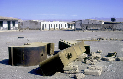 Schnurgerade zieht das schwarze Asphaltband der Panamericana durch die Atacama-Wüste. Rechts und links der Straße umgepflügte schmutzig-gelbe Erde, so weit das Auge reicht. In der Ferne ragt ein schlanker Schornstein in die Höhe. Beim Näherkommen sind verrostete Fabrikanlagen und verfallene Häuser zu erkennen. Auf Höhe der ersten Gebäude, deren Außenwände fast an die Fernstraße heranreichen, weist ein weiß-blaues Hinweisschild auf einen unscheinbaren Feldweg: „Chacabuco – Ex- oficina salitrera", ehemalige Salpetermine.